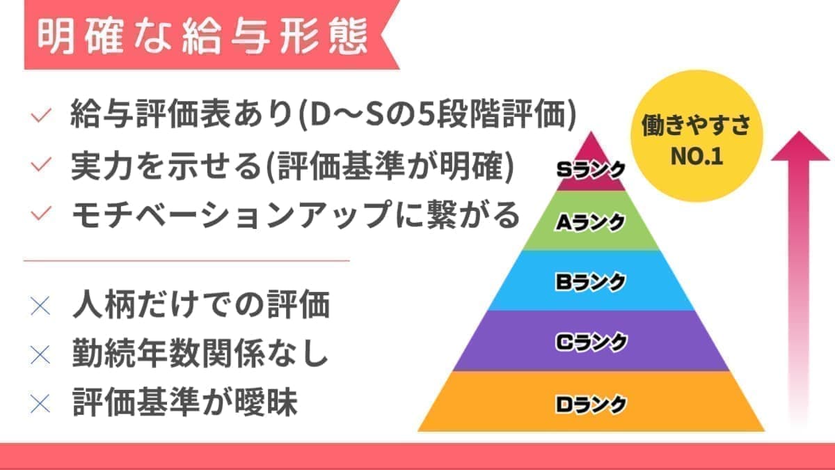 評価基準が明確で、成果や貢献度に応じて公平にランクが上がります。人柄や勤続年数だけではなく、努力と結果がしっかり反映される仕組みです。
